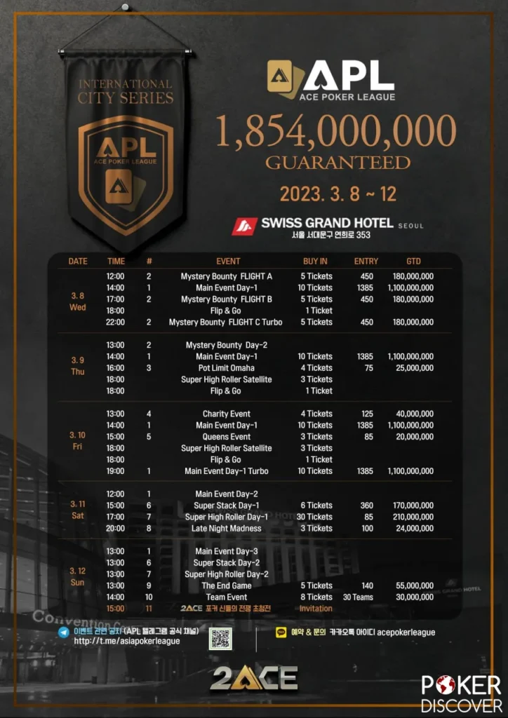 The Ace Poker League (APL) Korea at the Swiss Grand Hotel in Seoul is set to be a highlight in the global poker calendar. With its strategic location, luxurious ambiance, and an exchange rate favoring international participants, this tournament offers an unparalleled opportunity for players to immerse themselves in the thrill of poker while enjoying the world-class hospitality of the Swiss Grand Hotel. Save the dates, from February 27 to March 4, 2024, for a week of poker excellence in the heart of Seoul.