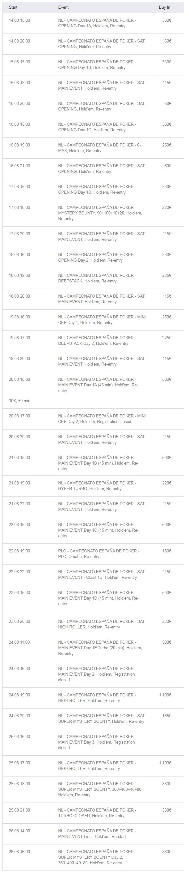 - Main Event Buy-in: 500€