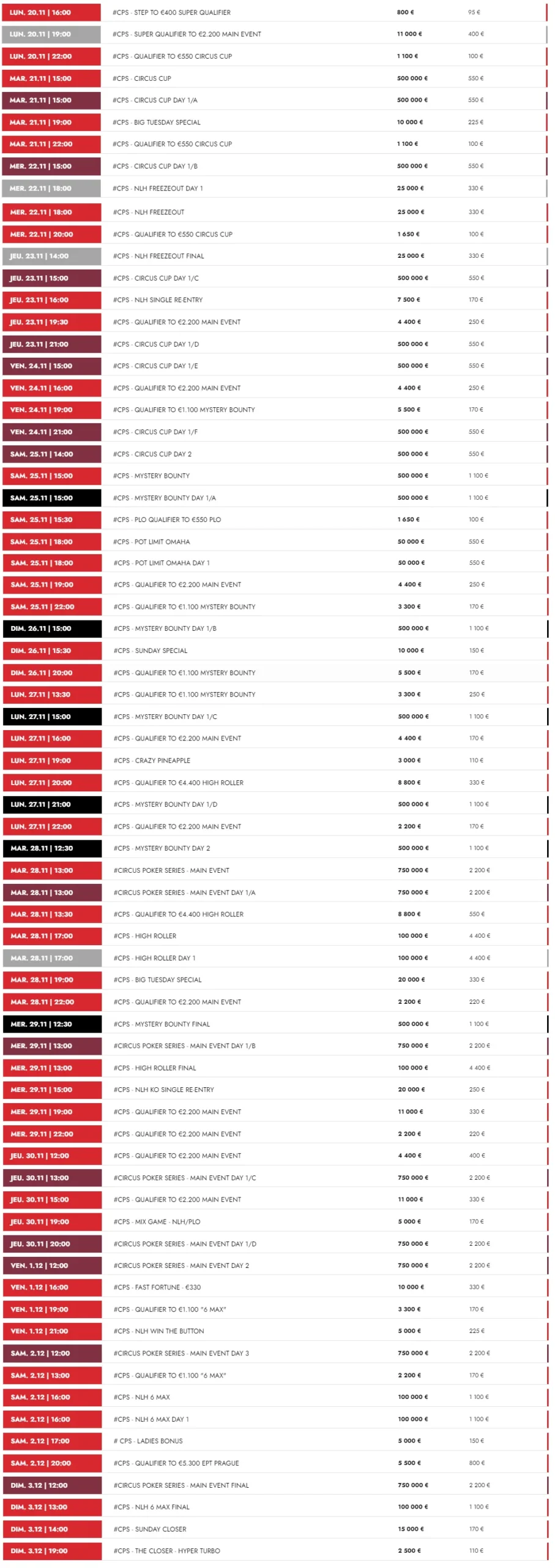 - Circus Cup: Running from 21st to 26th November, this €550 No Limit Hold’em event boasts a generous €500,000 guaranteed prize pool, ensuring high stakes and high rewards.