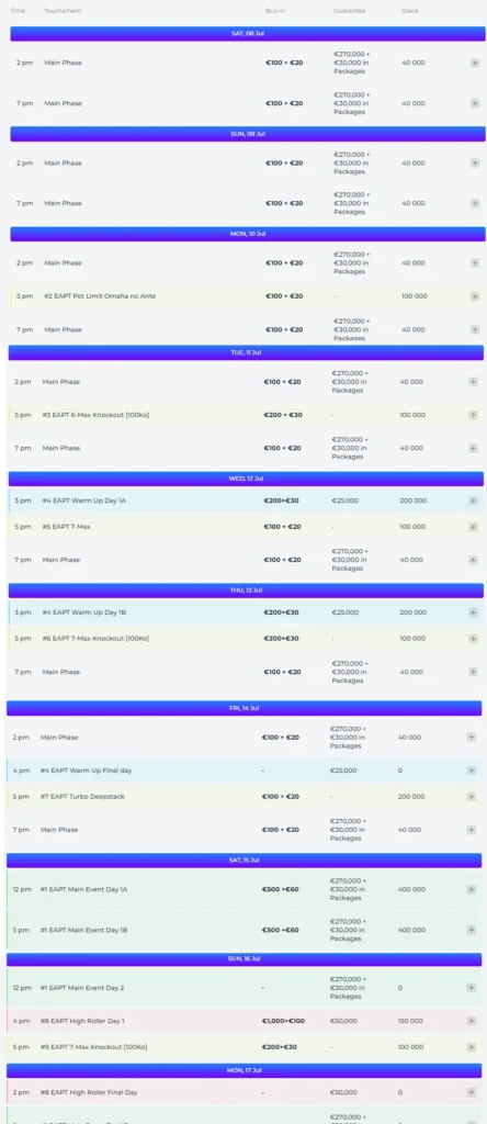 The EAPT Milan offers a diverse range of ten poker events, catering to players of all skill levels and preferences. Let’s explore some of the exciting highlights: