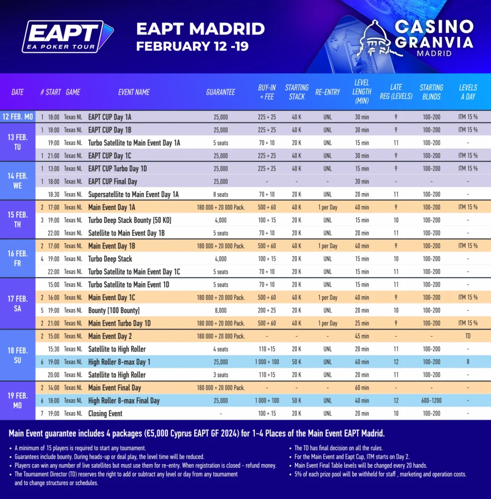 Get ready for an exhilarating week of poker as the EA Poker Tour (EAPT) descends upon Madrid from February 12th to 19th, 2024. Organized by Gran Via, this series guarantees an electrifying experience for poker enthusiasts and professionals alike.