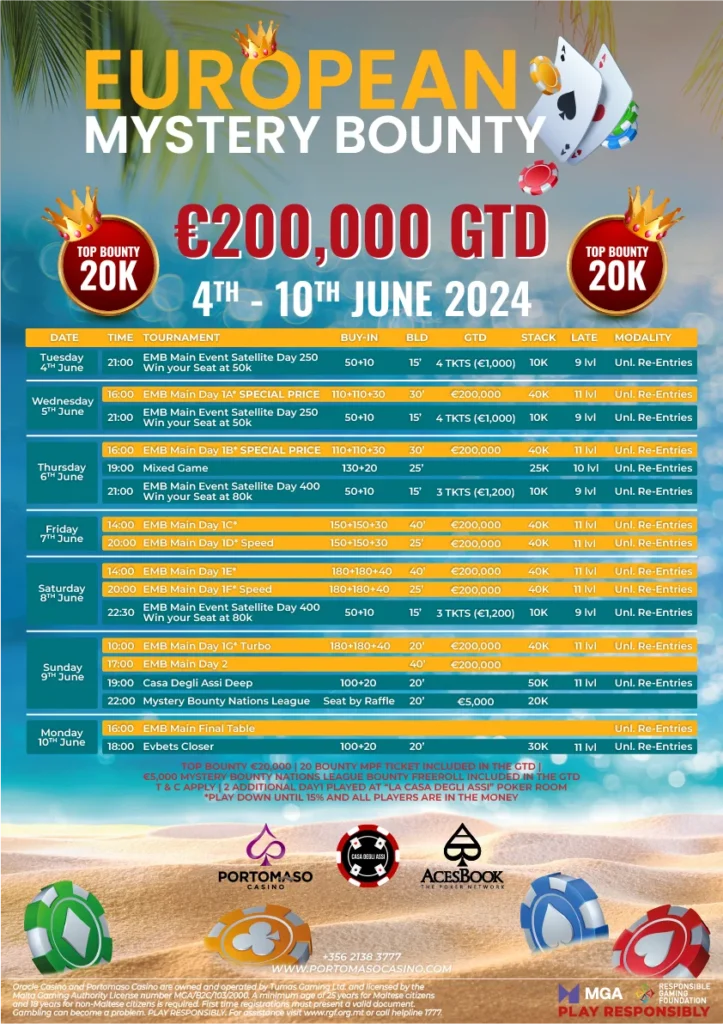 Whether you’re a seasoned pro looking to showcase your skills against top competition or a recreational player seeking an unforgettable poker experience in a stunning location, the European Mystery Bounty at Portomaso Casino is not to be missed. Mark your calendars, sharpen your poker strategies, and get ready for an epic showdown in the heart of the Mediterranean. With €200,000 up for grabs and the allure of Malta’s charm beckoning, the European Mystery Bounty promises to be an unforgettable poker adventure for all who attend.