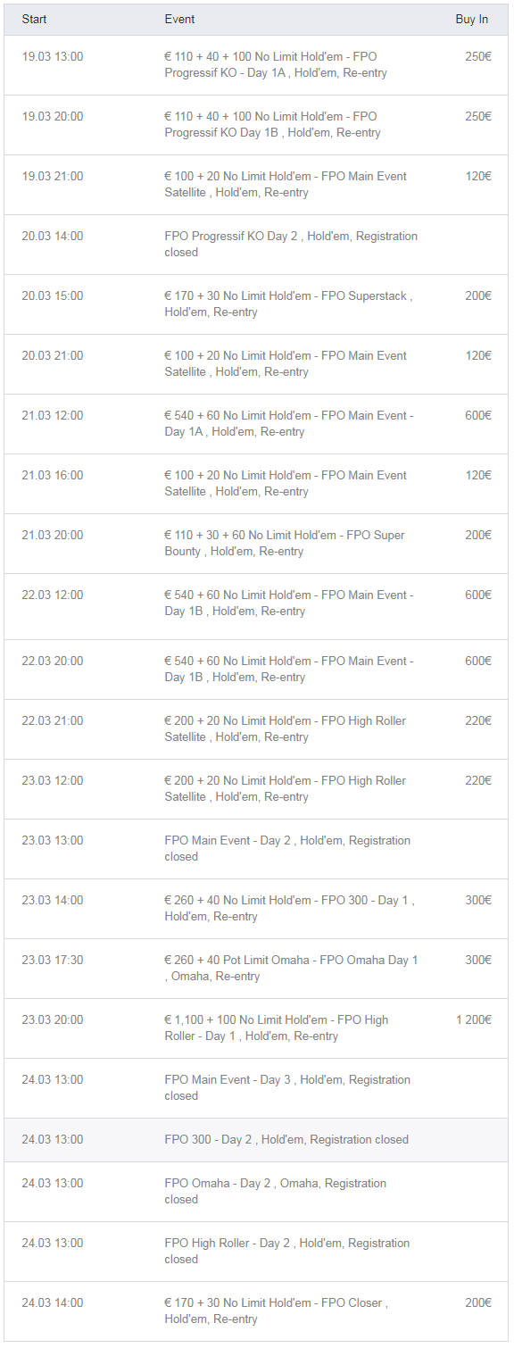 - Main Event: €600 buy-in, Hold’em, Re-entry