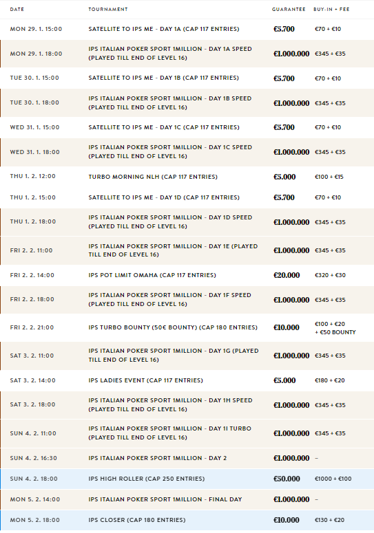 Get ready for a poker extravaganza like never before! The IPS Italian Poker Sport 2024 1Million Tournament is set to unfold from January 29th to February 5th, 2024, at the prestigious King’s Casino Rozvadov. With a jaw-dropping €1,000,000 guaranteed prize pool, this event promises high-stakes action, intense competition, and a week filled with poker prowess.