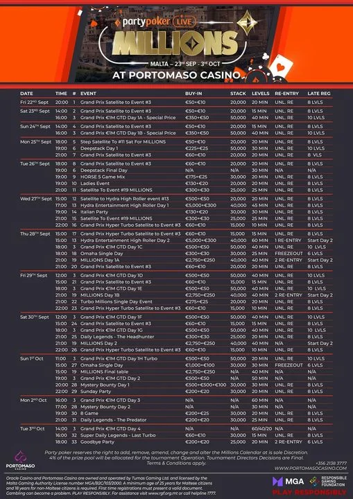 From September 23rd to October 2nd, 2023, all eyes in the poker world will turn to the stunning island of Malta for the highly anticipated return of the PartyPoker MILLIONS event. The poker enthusiasts will gather at the prestigious Casino Portomaso for an unforgettable festival. They will see a variety of thrilling events including the 1M GTD Grand Prix and the renowned MILLIONS Main Event, with a buy-in of €3,000.