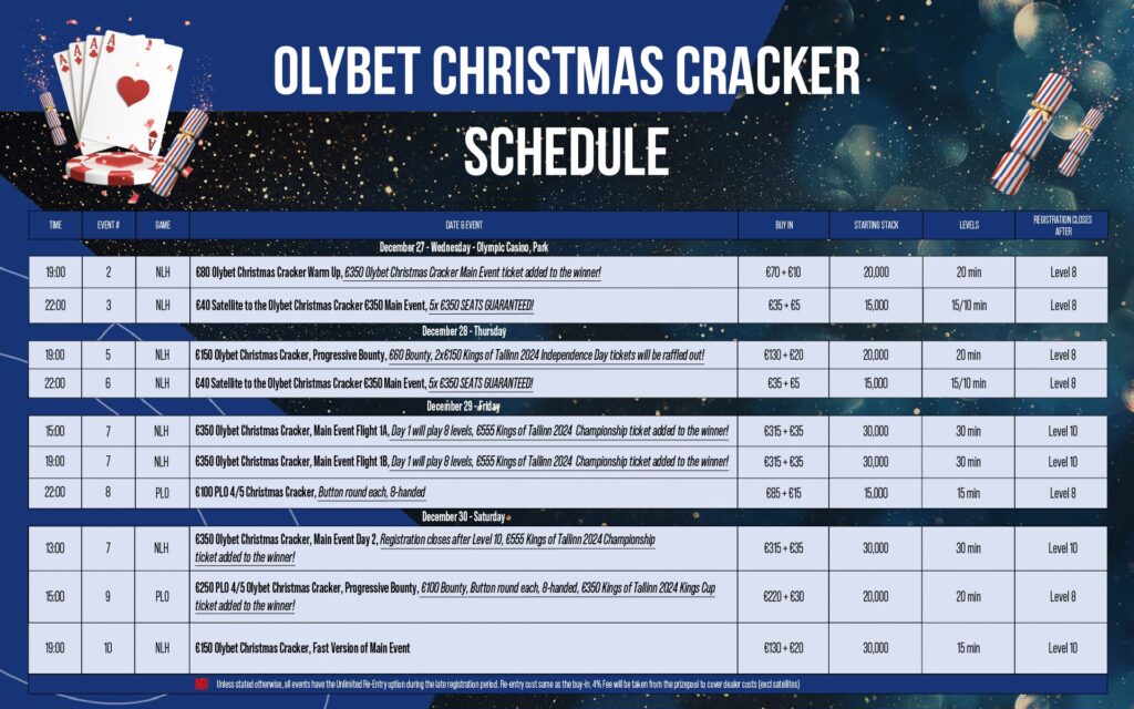 - Opening Day (Dec 26): The festival kicks off at 1:00 PM with a free-entry satellite tournament. At 5:00 PM, players can join the €250 NLH OlyBet Christmas Cracker Opening Event.