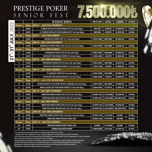 The festival runs from July 21 to 31, offering ten days of thrilling poker action. With a guaranteed prize pool of 7,500,000 TL, participants can expect intense competition and the chance to win substantial rewards. This event is specially curated for senior players, providing a welcoming and exciting atmosphere for seasoned poker professionals and enthusiasts alike.