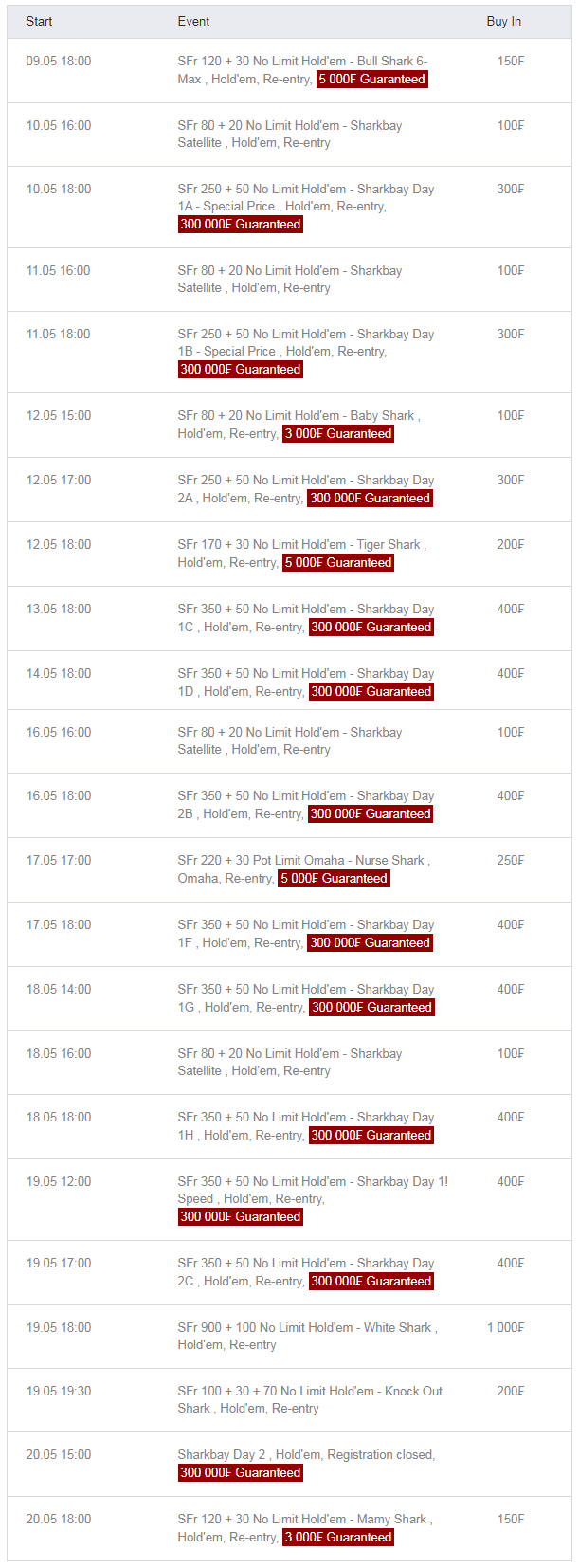 In addition to the Main Event, players can also participate in the SFr250 + 50 No Limit Hold’em Sharkbay Day 1A Special Price tournament. With a guaranteed prize pool of SFr300,000, 50,000 starting chips, and 40-minute levels, this tournament offers another exciting opportunity to showcase your poker prowess. Players who advance will move on to Day 2A for a shot at even greater prizes.