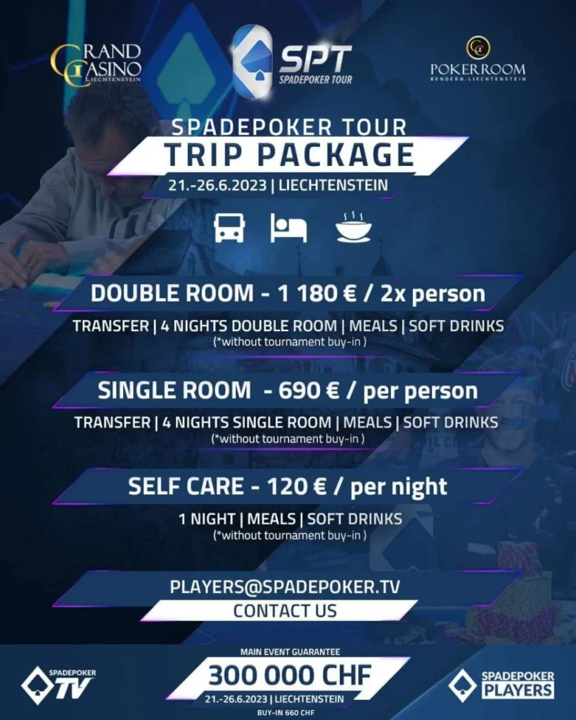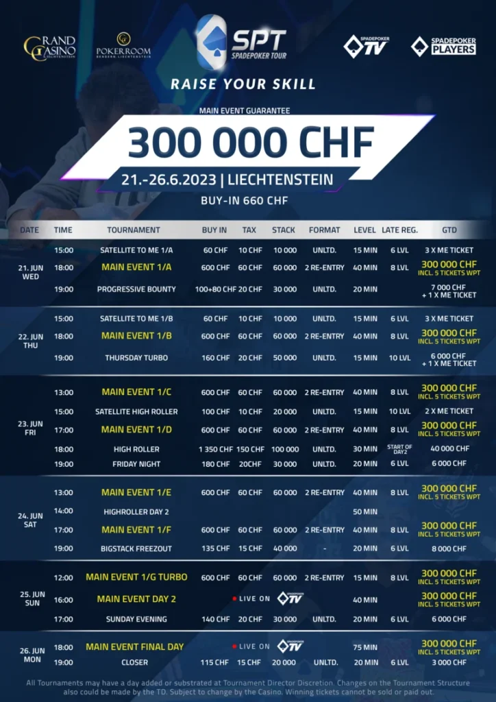 From June 21 to June 26, Grand Casino Liechtenstein will be abuzz with the SpadePoker Tour Liechtenstein, boasting the largest guarantee to date – a staggering 300,000 CHF. The Main Event buy-in is set at 660 CHF, granting players access to a highly lucrative tournament structure reminiscent of high-roller events. Prepare yourself for an exhilarating competition as you kick off with a starting stack of 60,000 chips, enjoy 40-minute levels, and take advantage of an extended late registration period of 8 levels.
