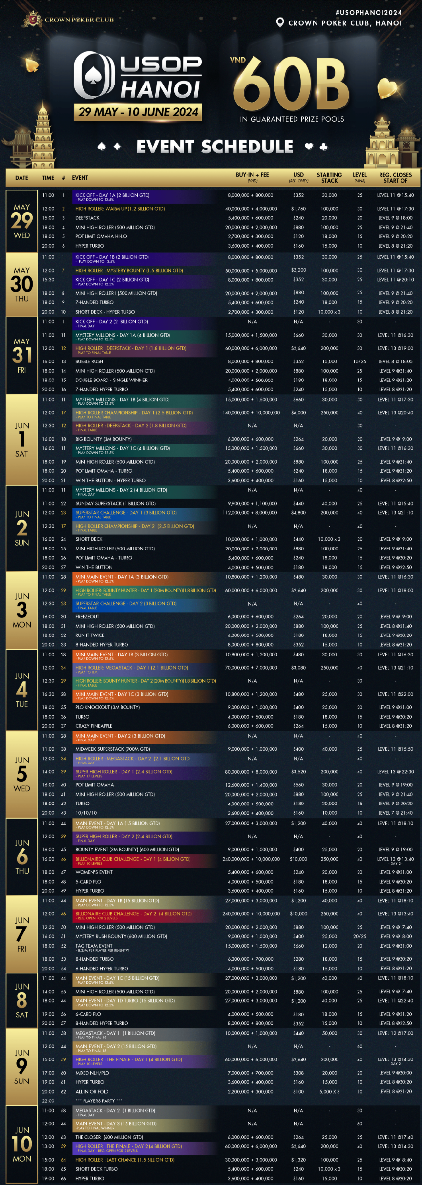 In addition to the main event, the USOP Hanoi 2024 features a diverse range of tournaments catering to players of all levels and preferences. From high-stakes showdowns to more accessible events, there’s something for everyone at this premier poker series, ensuring that the thrill of the game is accessible to all who seek it.