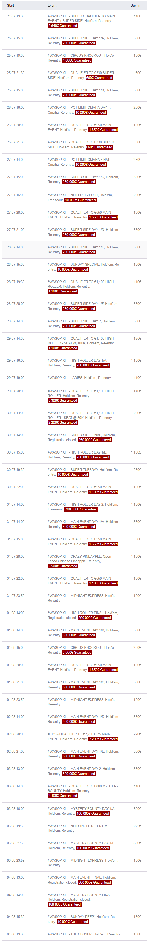 The centerpiece of WaSOP Namur XIII is the Main Event, featuring a buy-in of €550. This event is expected to attract a large and competitive field, offering players the chance to compete for a share of the substantial guaranteed prize pool.